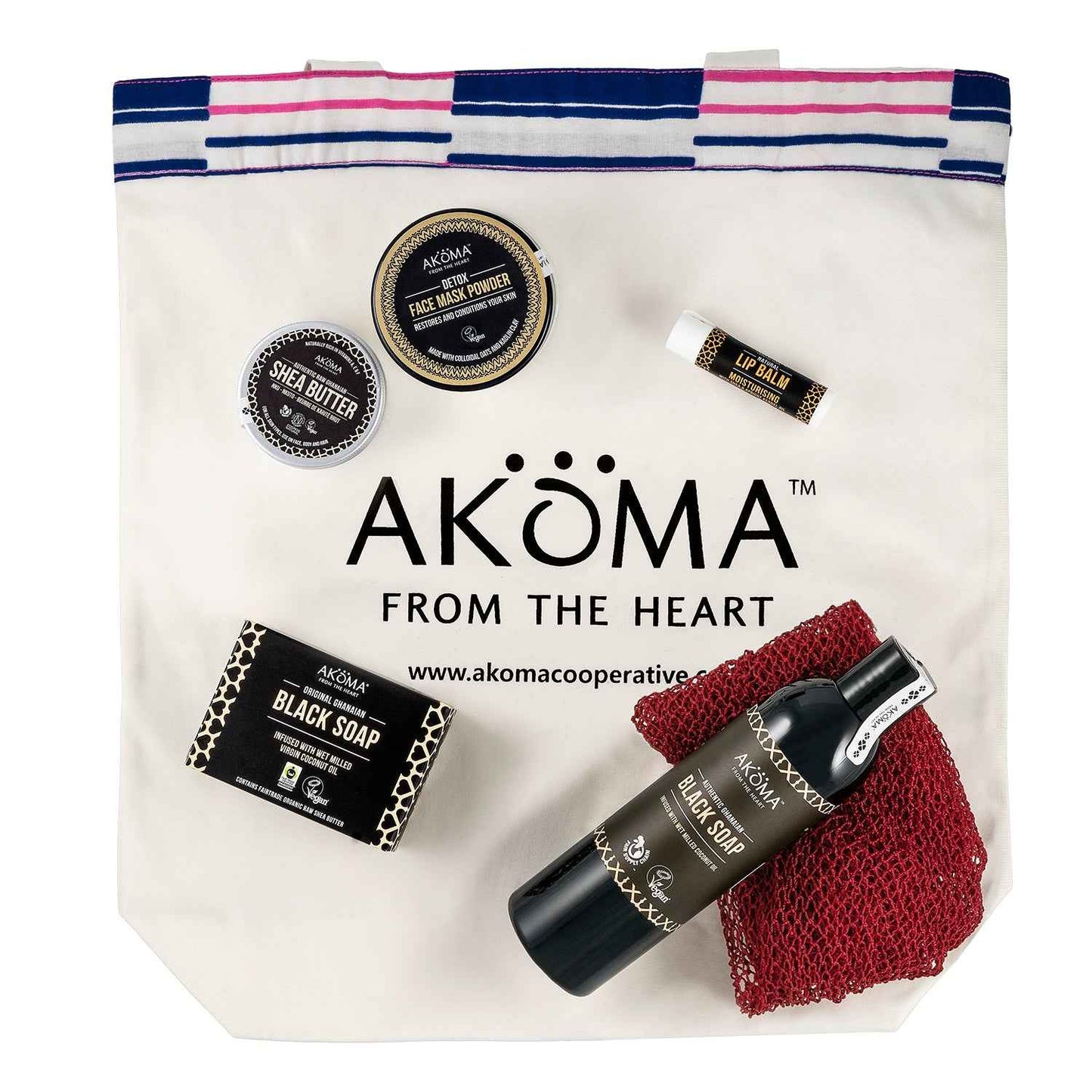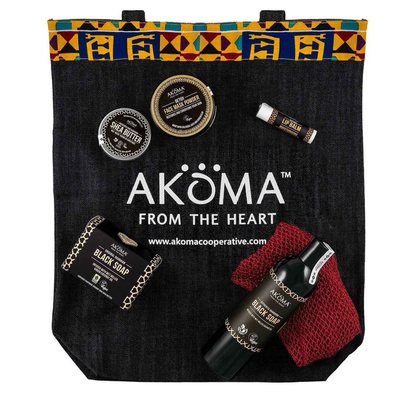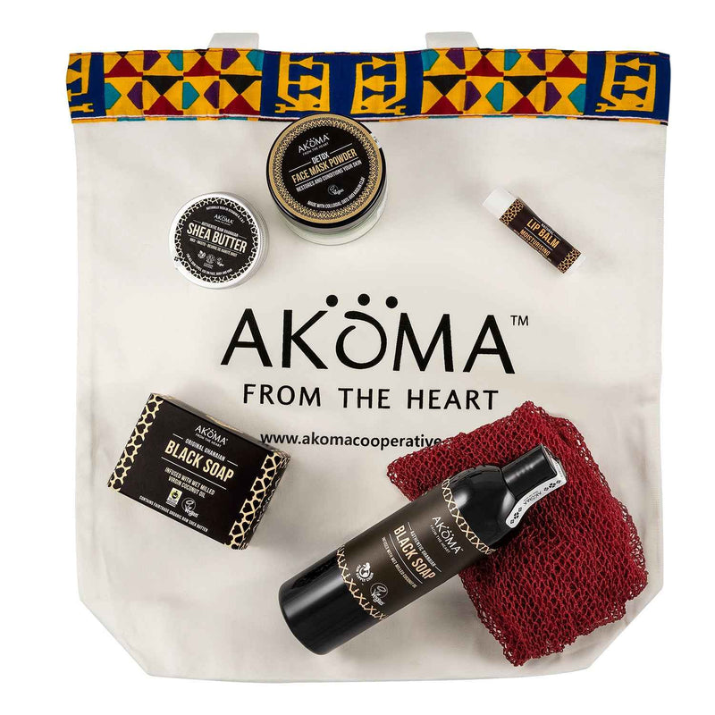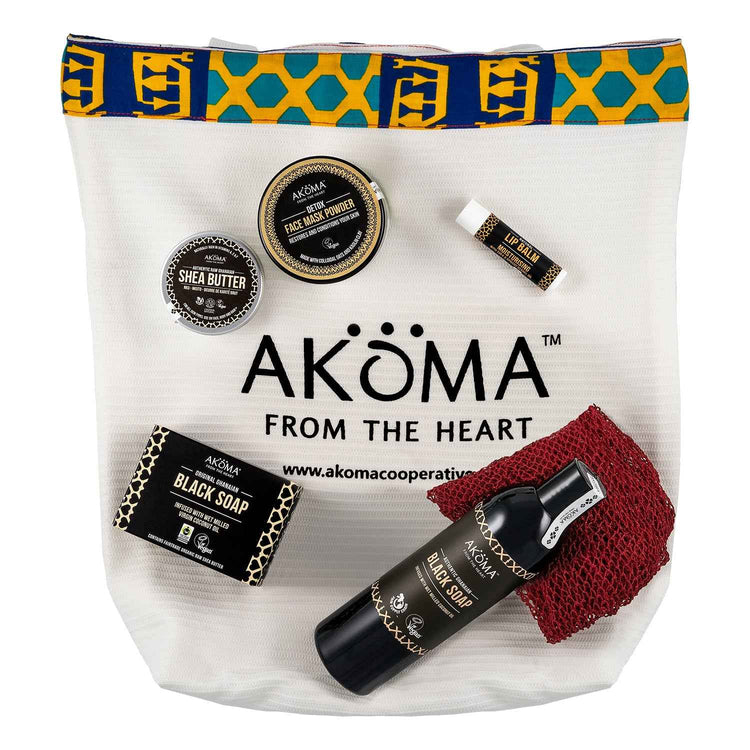 From our popular authentic black soap which is one of the healthiest soaps for the skin due to the purity and simplicity of the ingredients that are loaded with essential vitamins, minerals and antioxidants, to our moisturising authentic Ghanaian raw shea butter which also encourages collagen production and cell renewal, giving it anti-ageing credentials. All wrapped up with a Limited Edition Akoma tote bag that makes it easier to store or as a great shopping bag.